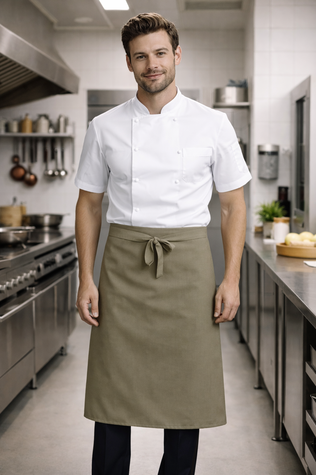 zástěra, kuchařská zástěra, vhodné také pro číšníky, someliéry, pekaře, cukráře, obchody,délka do pasu rozměry 70cmx60cm, 37 barev, 100% Polyester 200g/m2, prát do 65st.C, barva khaki, Více o produktu
