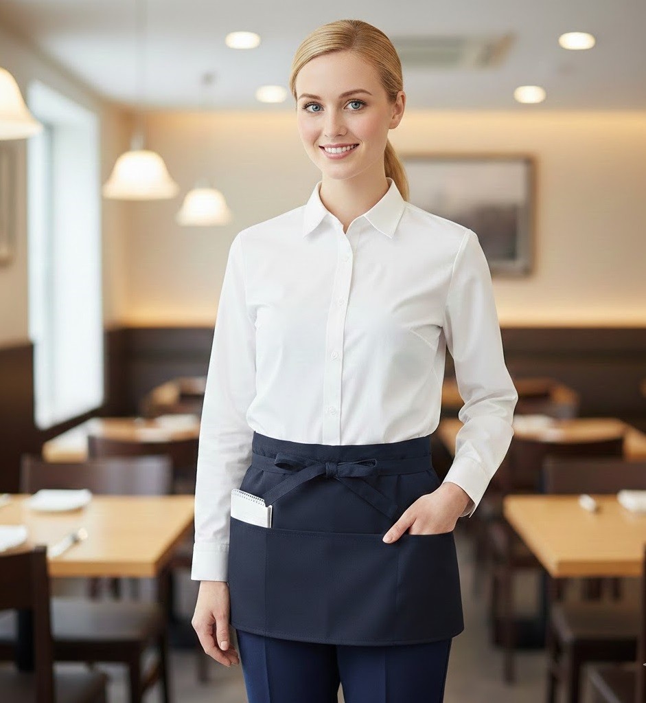 krátká číšnická zástěra do pasu se 3 kapsami na peněženku, účtenky, kalkulačku a pero, 65/35 PES/bavlna, rozměry 60cm x 30cm, kapsa rozdělena do tří sekcí, hloubka kapsy 20cm, vhodné pro průmyslové praní, prát max do 65st.C, odolné proti bělidlům, barva černá, Více o produktu