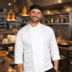 klasický kuchařský rondon s černými knoflíky a dlouhými rukávy, pánský i dámský, 65/35 polyester/bavlna, vyjímatelné knoflíky, na levém rukávu kapsička na dvě pera, váha 200g/m2, francouzská manžeta, Více o produktu