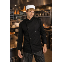 klasický kuchařský rondon s dlouhým rukávem a knoflíky, pánský i dámský, 65/35 polyester/bavlna, vyjímatelné knoflíky, na levém rukávu kapsička na dvě pera, váha 200g/m2, francouzská manžeta, barva černá, Více o produktu