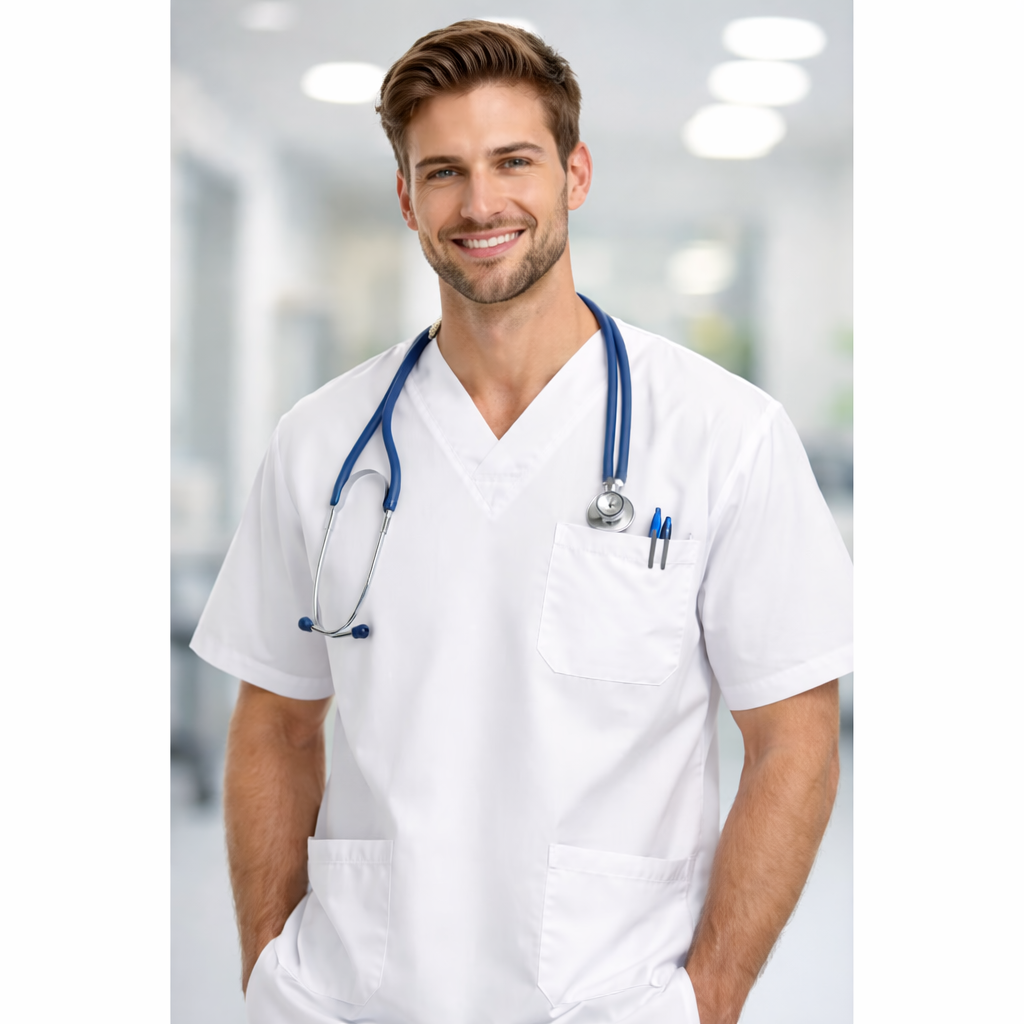 zdravotnická halena, 35% bavlna a 65% polyster, 3 kapsy, prát do 90st.C, krátký rukáv, dámská i pánská, výstřih do V, váha 170g/m2, barva bílá Více o produktu