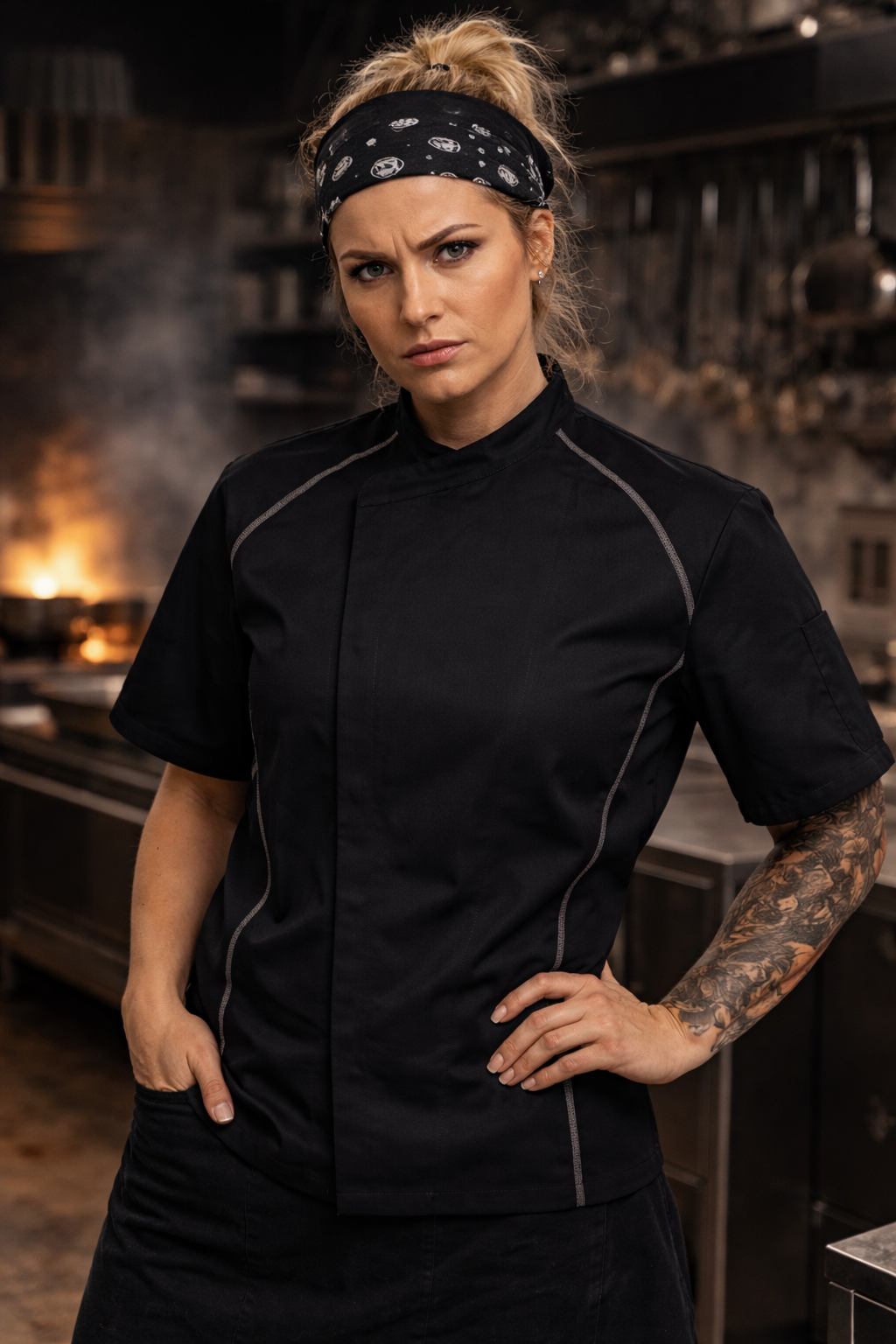 Černý kuchařský rondon Kentaur 23400 s šedými detaily a krátkým rukávem je ideální volbou pro týmy, které chtějí v kuchyni vypadat moderně a zároveň vyžadují maximální funkčnost. Díky svému unisex střihu je tento model univerzálním řešením pro kuchaře i kuchařky, přičemž kontrastní šedé prvky dodávají oděvu dynamický a profesionální vzhled. Více o produktu