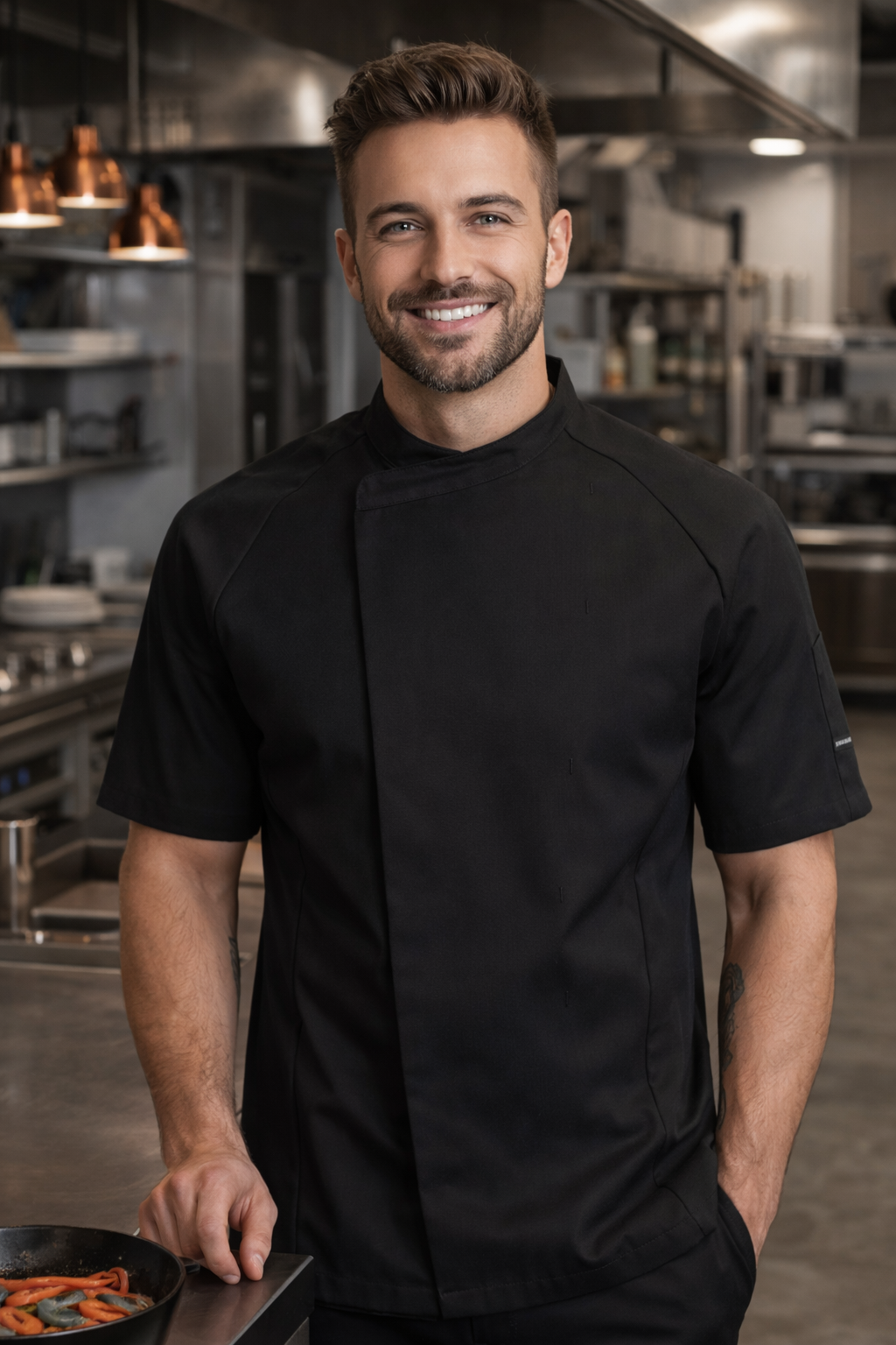 slim fit kuchařský rondon, cukrářský, pánský i dámský, 50% polyester a 50% bavlna, rozdělená kapsička na tužku na levé paži, poutko za krkem pro přichycení zástěry, zapínání na cvočky, prát do 95st.C, barva černá, Více o produktu