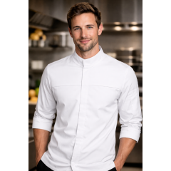 kuchařský rondon s dlouhým rukávem, pánský i dámský, stojací límeček, na prsou ukryté zapínání na druky pro zástěru, která není součástí rondonu, výhoda zástěry bez pásku za krkem, vzadu vypasovaný, zapínání na skryté druky, rukáv lze vytáhnout k loktům a uchytit na skrytou gumu, barva bílá, Více o produktu