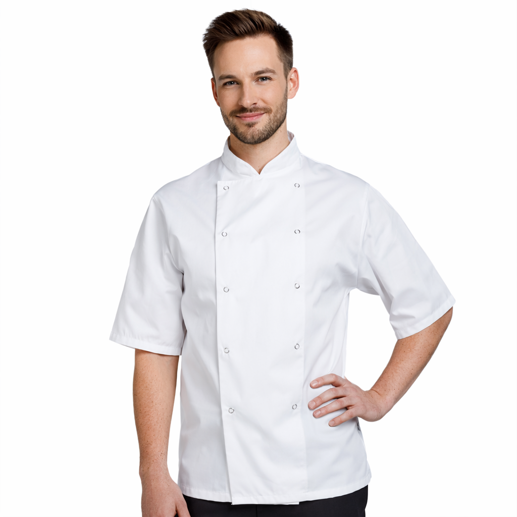 kuchařský rondon pánský i dámský s krátkým rukávem, levná varianta pro učně nebo začínající kuchaře, 65% polyester a 35% bavlna, váha 180 g/m2, prát do 60 st.C, bílý Více o produktu