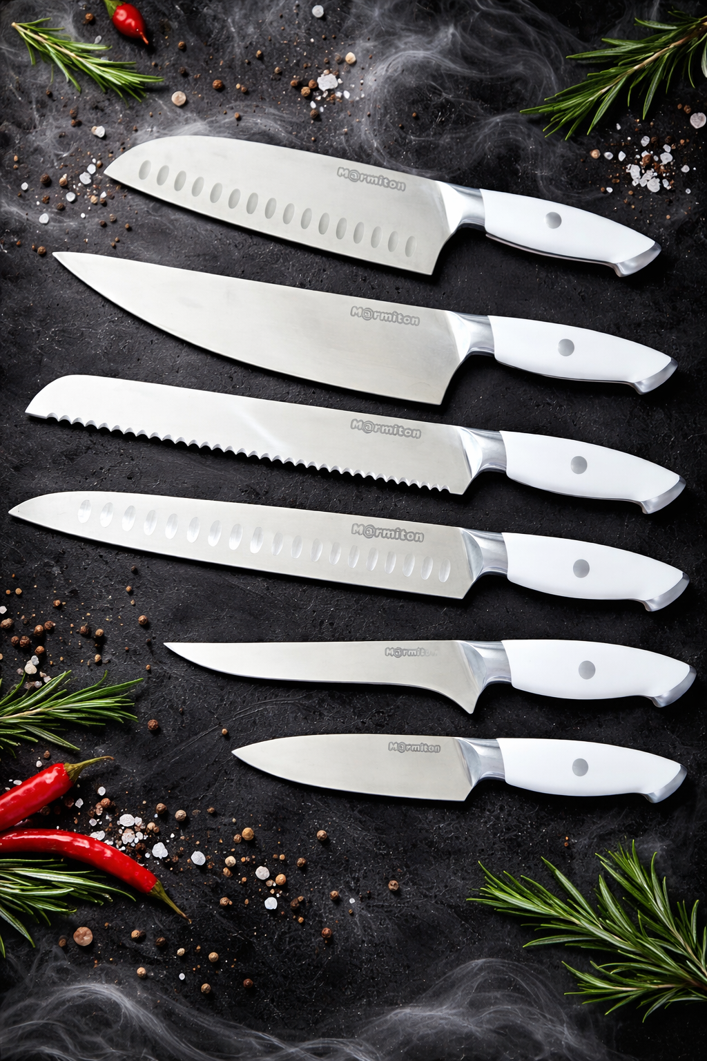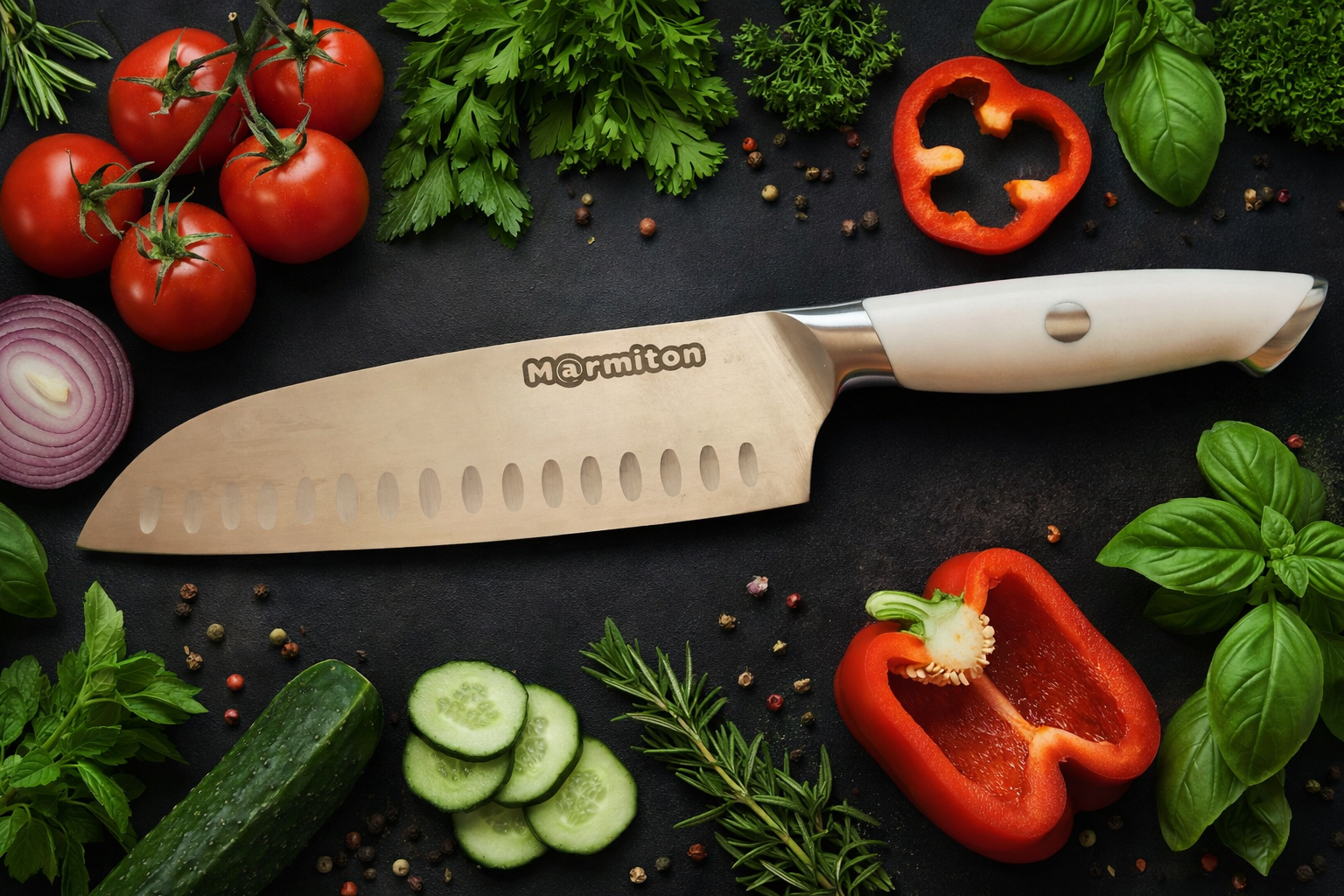 japonský styl nože, vyráběný pod našim jménem "Marmiton" v Hong Kongu, Santoku kuchařský nůž, délka čepele 18 cm, materiál čepele nerezová ocel, materiál rukojeti ABS barva bíla Více o produktu
