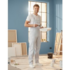 montérkové kalhoty s laclem pánské dámské, materiál 100% nesrážlivá bavlna 280 g/m², zkřížené šle s vnitřní gumou a plastovými přezkami, s gumou v pase na zádech, zapínání na klopu na knoflíky, jedna velká náprsní kapsa se zapínáním na zip, dvě přední kapsy, jedna zadní kapsa se zapínáním na knoflík, držák na metr na pravé nohavici. Boční otevírání vpravo se zapínáním na knoflík, kontrastní barevné prošívání, praní na 60°C, žehlení při nízké teplotě, sušení v sušičce při nízkých teplotách, certifikace Category 1 for minimum risks, barva šedá Více o produktu