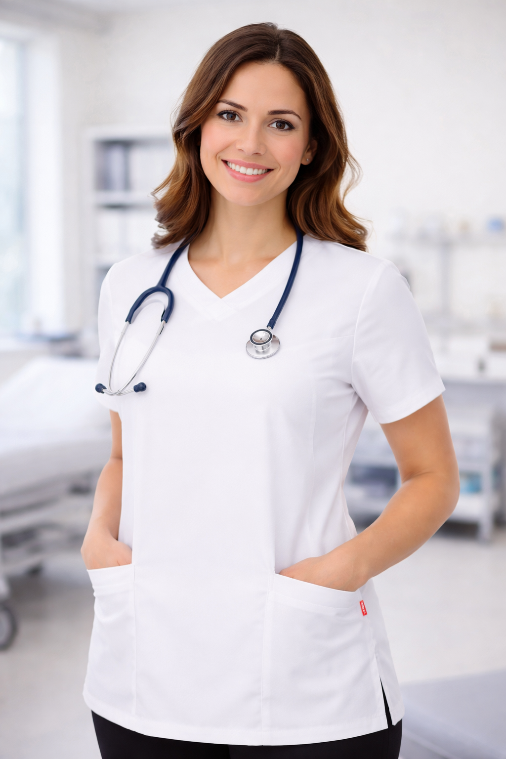 Lehká a prodyšná dámská zdravotnícká halena se slim fit střihem, výstřihem do V a zadními otvory pro lepší ventilaci. Vyrobena z recyklovaného polyesteru s antibakteriální úpravou SilverPlus, odpuzuje tekutiny a eliminuje zápach. Díky technologii PureStretch nabízí pružnost a výjimečné pohodlí. Má tři praktické přední kapsy, pratelná až na 60 °C, barva bílá Více o produktu